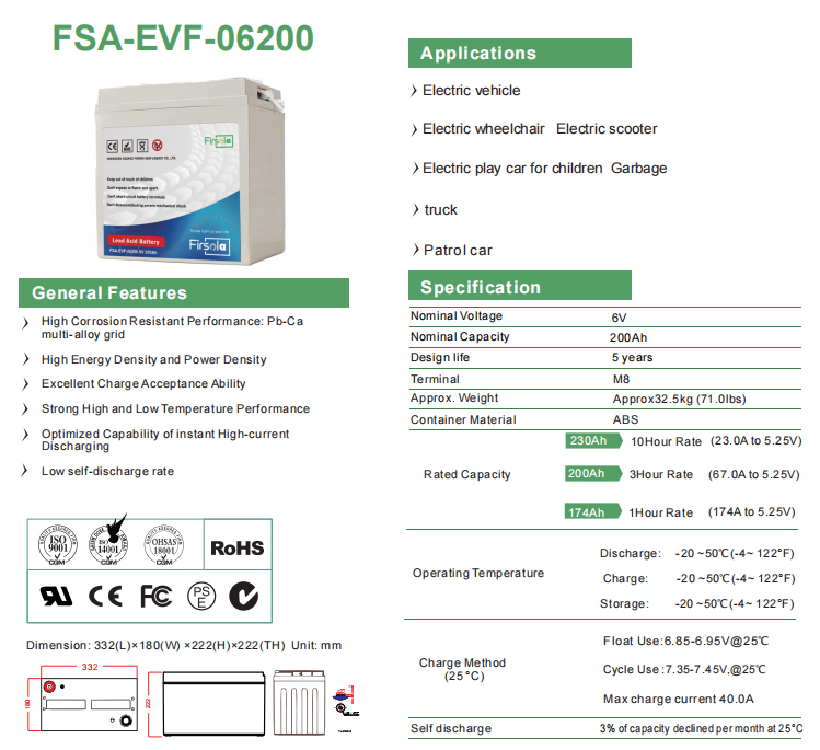 Item | Rate Voltage (V) | Rate Capacity (Ah/10hr) | Terminal | Length | Width | Height | Total Height | Weight(Kg) |